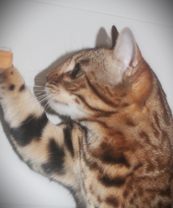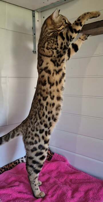 Un chaton qui enfin permet un si joli équilibre entre le type, look sauvage, avec de grands yeux, une belle expression, mais aussi une belle structure, un long corps très félin avec une robe a rosettes sublime, une couleur chaude, bien contrastée, un pelage doux et soyeux