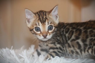 Un chaton qui enfin permet un si joli équilibre entre le type, look sauvage, avec de grands yeux, une belle expression, mais aussi une belle structure, un long corps très félin avec une robe a rosettes sublime, une couleur chaude, bien contrastée, un pelage doux et soyeux